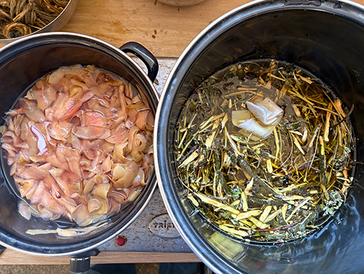 Puur verfbad: Kook plantmateriaal 3 uur in water met een proeflapje.