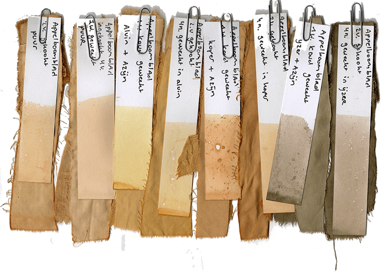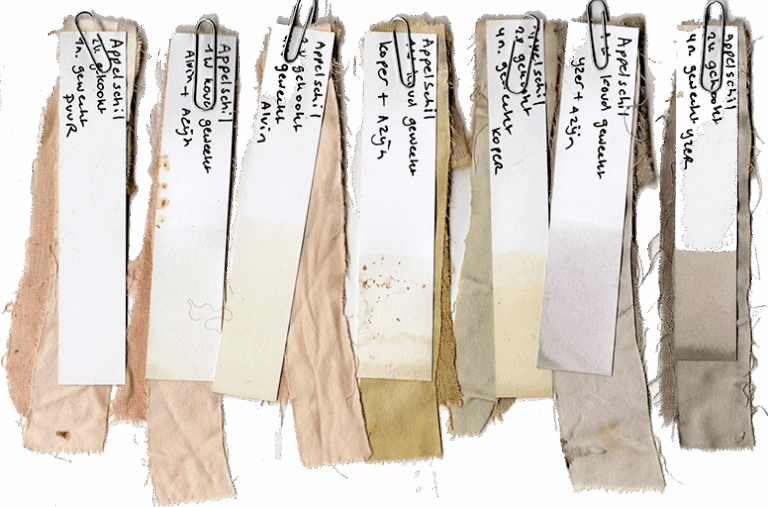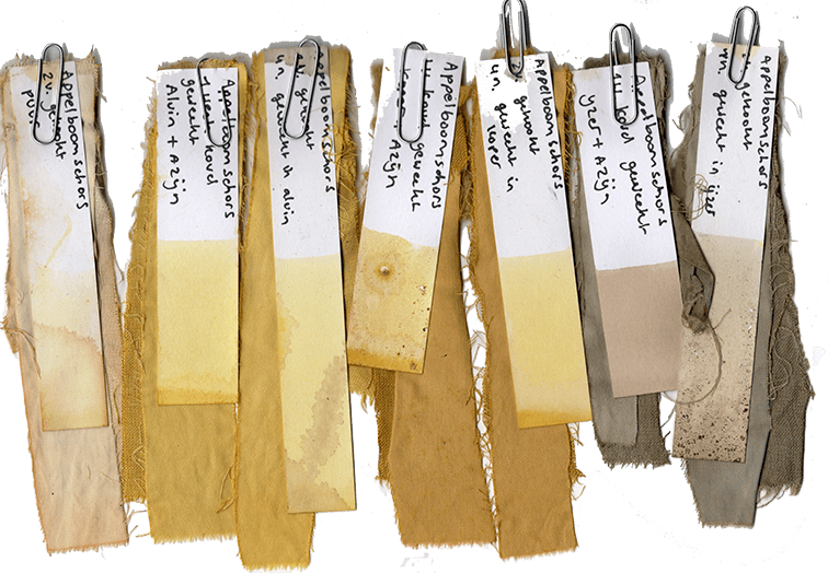 Opvallend was de gele kleur die uit de schors kwam in combinatie met aluin. De bladeren gaven meer bruin-gele tinten, terwijl de appelschillen subtiel licht roze-groen lieten zien. De kleur van de schillen was niet erg sterk en zal waarschijnlijk niet langdurig op het textiel blijven zitten, maar het was interessant om te ontdekken hoe elk deel van de boom zijn eigen tinten bijdraagt.