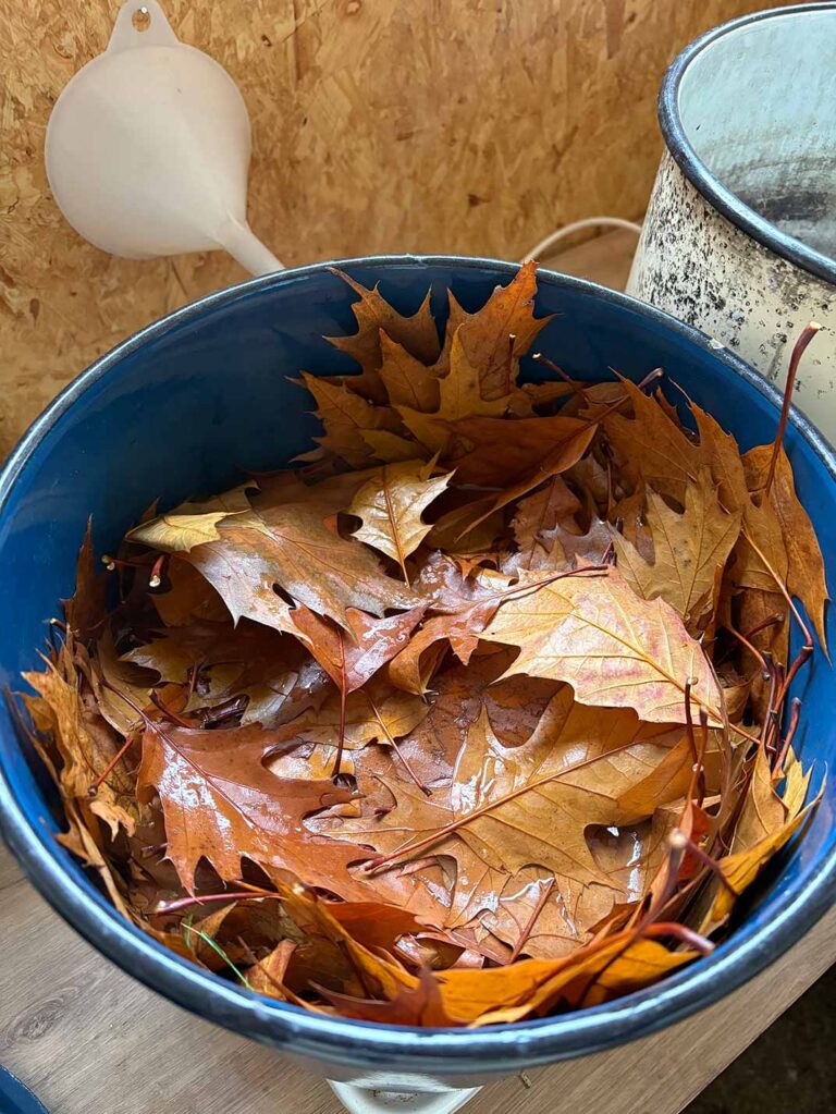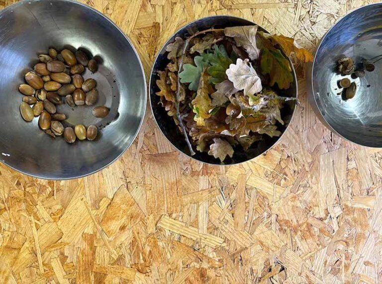 De bladeren gaven zachte geeltinten, de eikels warme bruin- en beigetinten — passend bij de natuurlijke tannines in de plant, die al eeuwen worden gebruikt om wol, linnen en leer te kleuren.