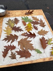 Met de bladeren hebben we ook geëcoprint: dat werkte verrassend helder, met duidelijke nerven en silhouetten (zie foto’s onderaan).