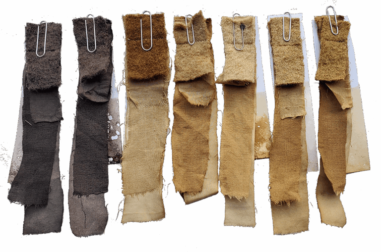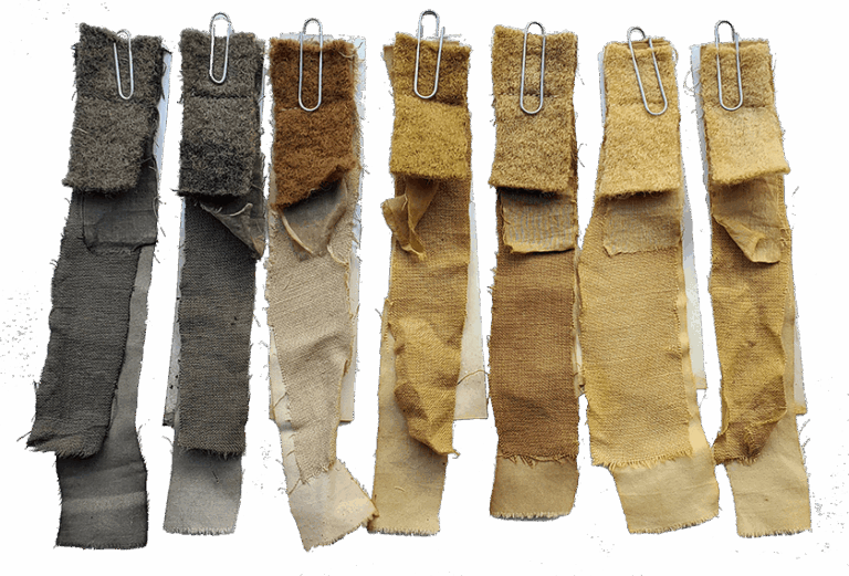 Proeflapjes van natuurlijke vezels (katoen, linnen, wol, zijde)