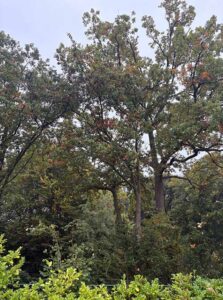 Op het terrein staan ook enkele Amerikaanse rode eiken met grotere, puntigere bladeren. Kun jij ze vinden?