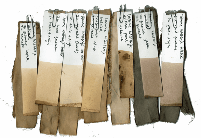 In het Kleurenlab experimenteerden we met de schillen en bolsters van de tamme kastanje. We maakten drie verfbaden: één met de bolsters en twee met de schillen — één van alleen de schillen van gepofte kastanjes (de noten aten we op) en één met de hele kastanje, kort gekookt en daarna gepeld. De schillen gaven zachte roze- en bruintinten, die weinig van elkaar verschilden. De bolsters leverden donkerdere bruin- en groentinten op. De bladeren zijn bovendien zeer geschikt voor ecoprints. Met de bast kun je ook goed verven, maar we wilden de bomen daar geen schade mee toebrengen.