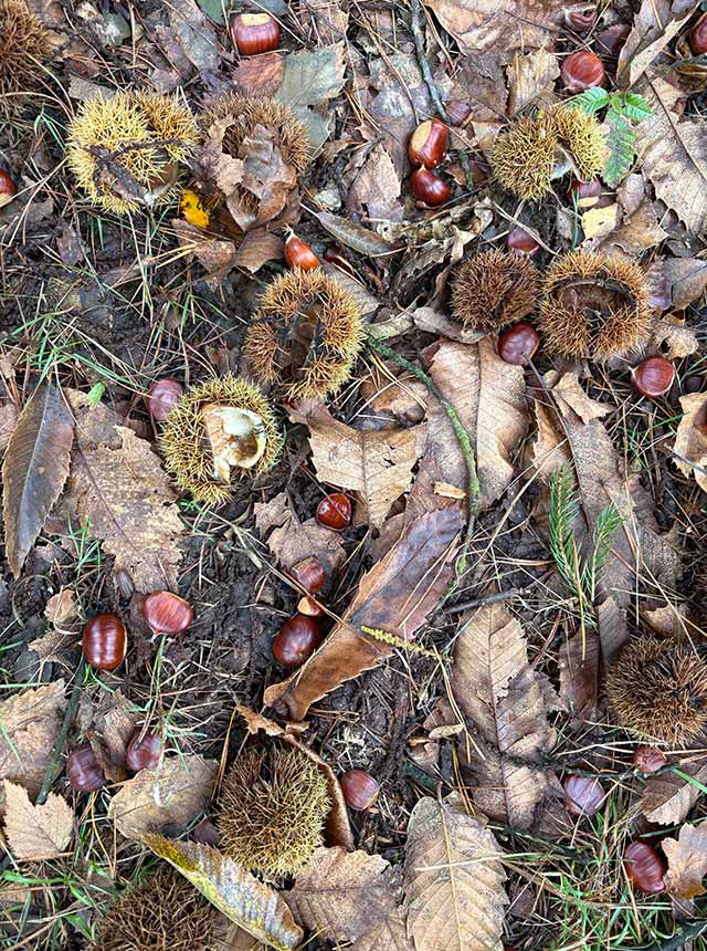 Voor je staan drie jonge tamme kastanjes. Ze komen uit Dennendal (Reinaerde, Den Dolder) en zijn door Robbie van de Groendienst hierheen gebracht omdat ze daar “in de weg stonden”. Ze dragen zelf nog geen vruchten, maar in het bos tegenover De Heygraeff groeien veel oudere kastanjebomen. Daar verzamelden we de kastanjes en bolsters voor dit experiment — precies in de periode dat ze massaal uit de bomen vielen.